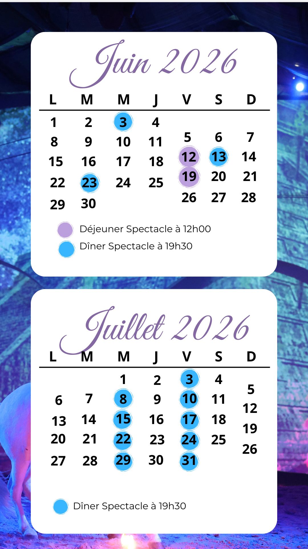 Confortablement installés dans la salle du Cabaret, les convives profitent des spectacles sur des gradins tout proches de la piste. La vision est optimale et salle est chauffée lorsque c'est utile.